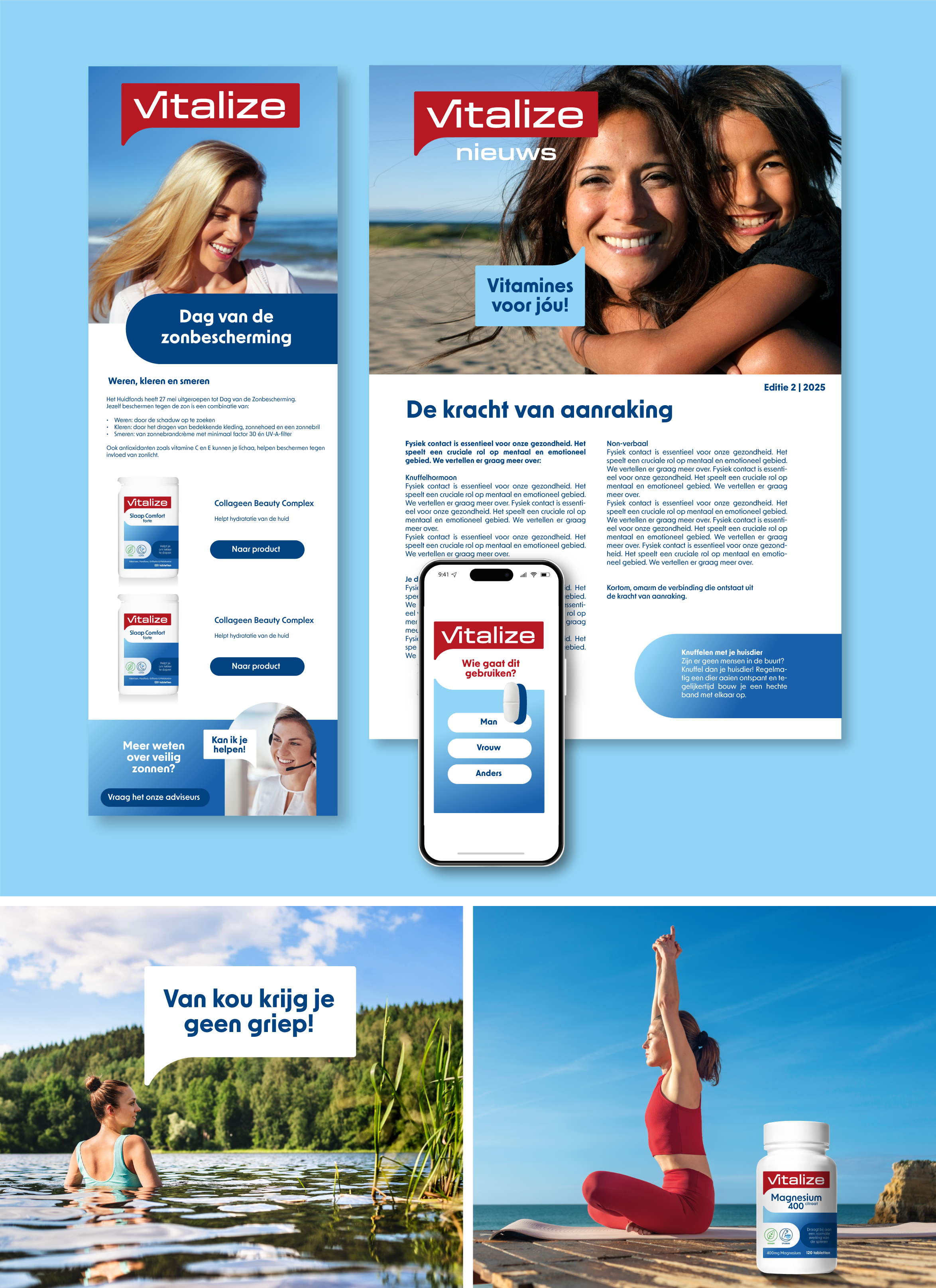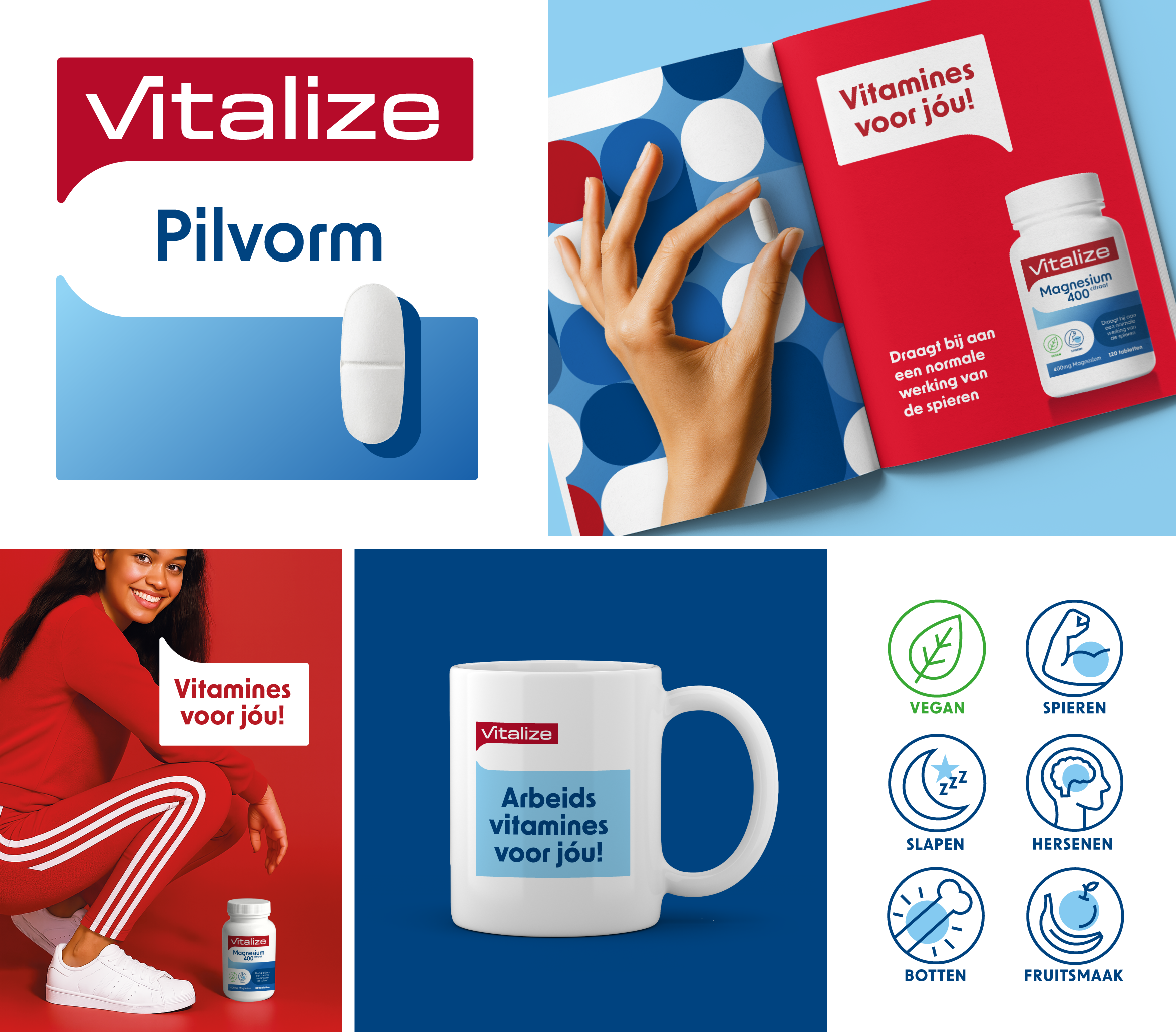 “Vitalize maakt het gebruiken van voedingssupplementen zo simpel mogelijk & zo persoonlijk als nodig” werd het nieuwe uitgangspunt. Aangescherpte waarden als verrassend direct, openhartig wijs, consistent betrouwbaar en empathisch behulpzaam zorgden voor een voelbaar merkkarakter als fundament. Het persoonlijke van Vitalize komt terug in de logovorm, een speech bubble. Dit werd een eigen, herkenbare brand asset waar vanuit de altijd bereikbare specialisten met je praten. Vanuit de speech bubble ontstaat ook de pilvorm, die we op het packaging design inzetten om consumenten op een vriendelijke manier te helpen navigeren. Het rood-wit-blauwe kleurpalet om de Nederlandse roots te accentueren, besloten we op een eigentijdse manier te behouden. De Vitalize typografie werd unieker, het merk kreeg zijn eigen icon set en een toegankelijke, eigen beeldstijl.