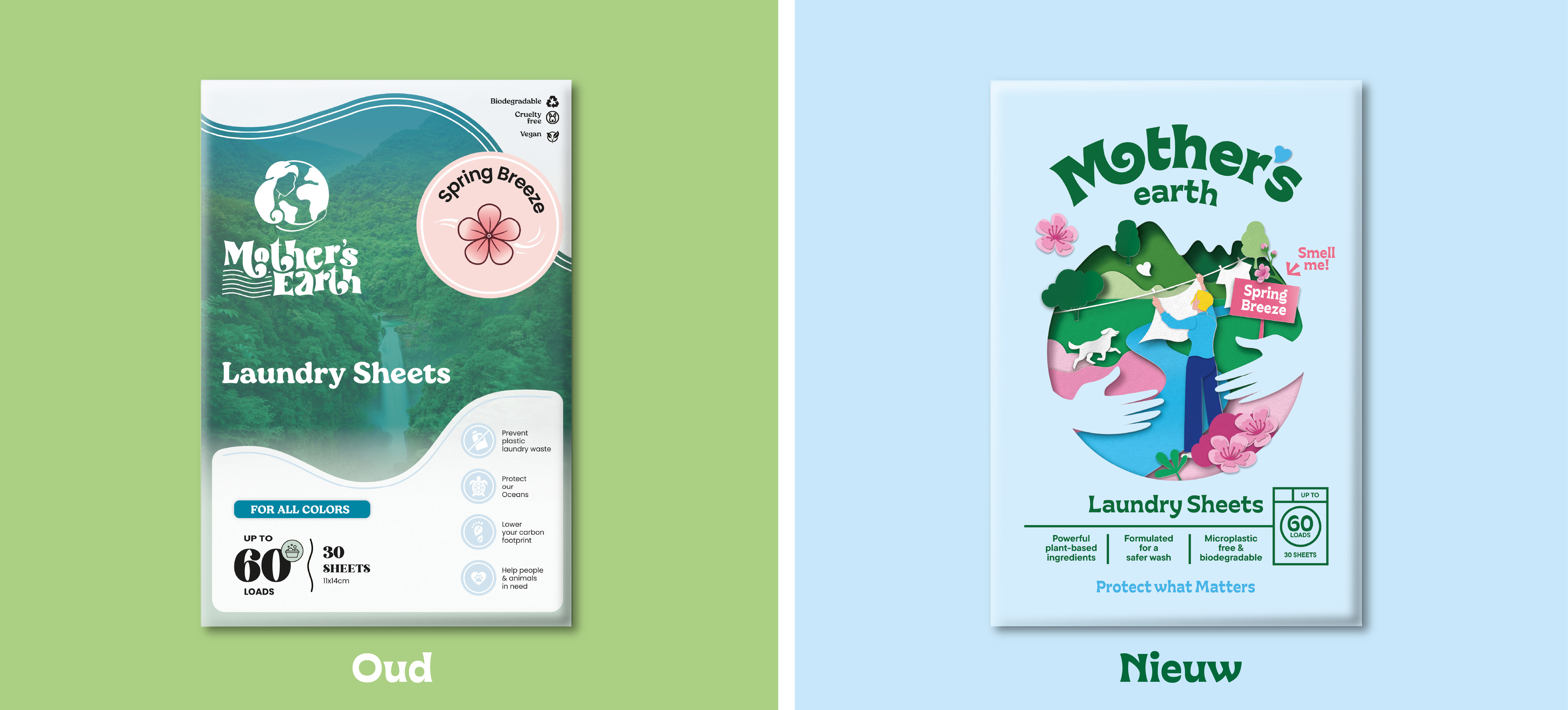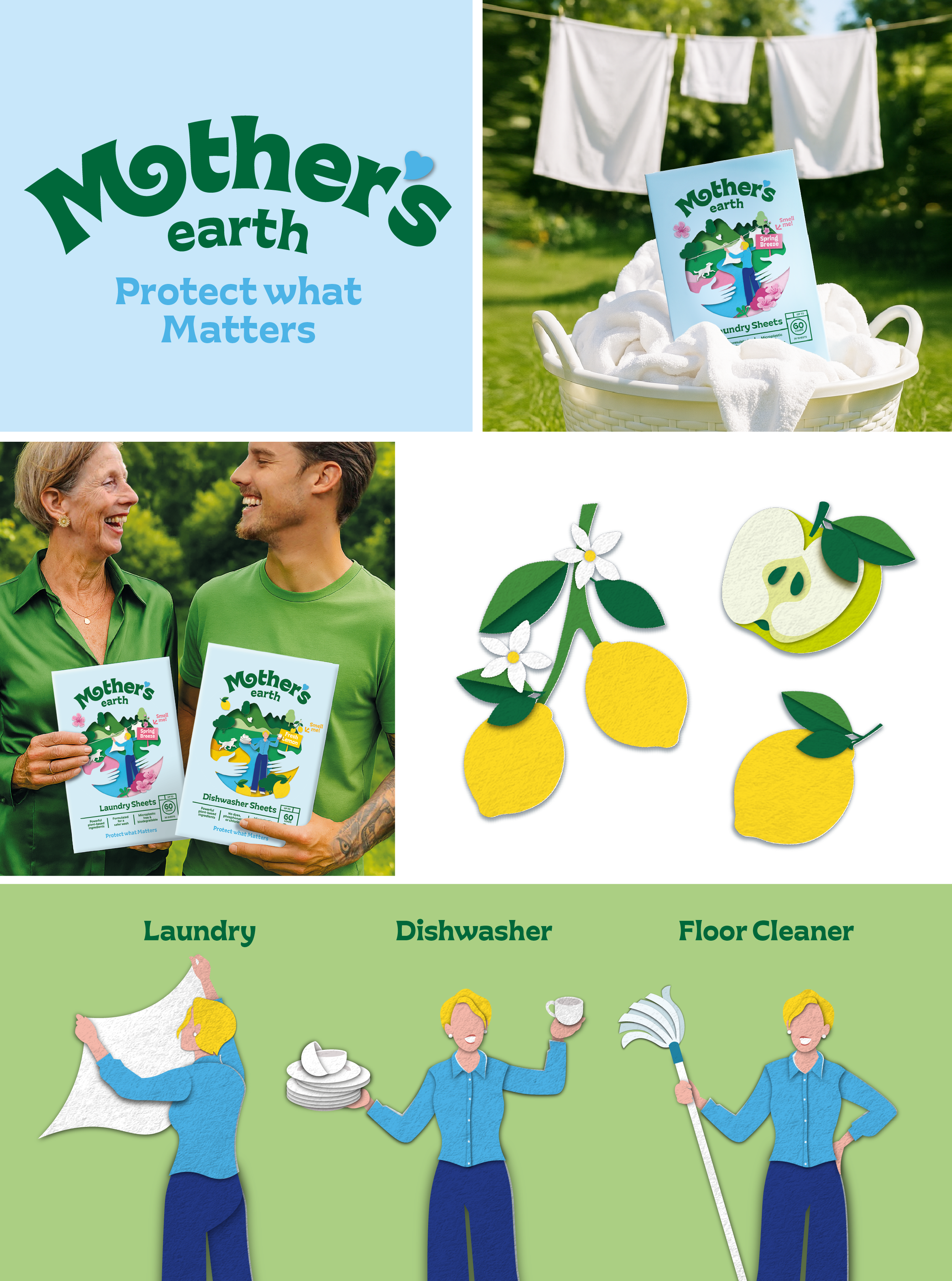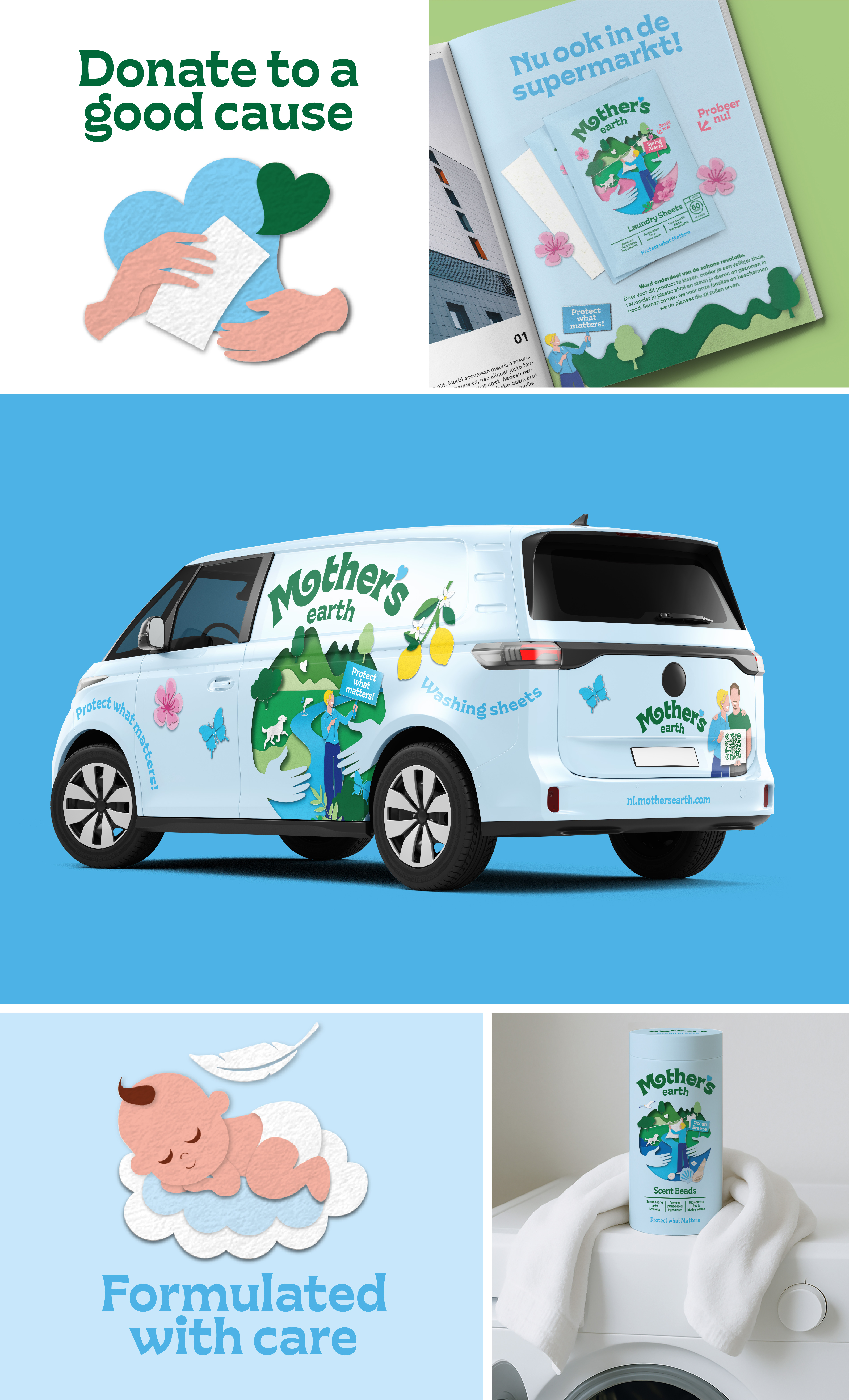 De schoonmaakmiddelen komen in de vorm van typische ‘papieren’ velletjes. Zo kwamen we op het idee voor een ‘paper-cut’ design; alle illustraties zijn gemaakt uit geknipt papier. Centraal plaatsten we de wereldbol, “Mothers’ Earth”. Deze wordt omarmd, want de missie is deze te beschermen. Lisette, de enthousiaste voorvechter in de schoonmaakrevolutie van Mothers’ Earth, staat ín de bol, naast natuur, dieren en schoon water. Het logo kreeg meer body, eigenheid en een vriendelijk en organisch karakter. De kleuren in de visuele identiteit zijn rijk en natuurlijk, wat het geheel tot leven laat komen.